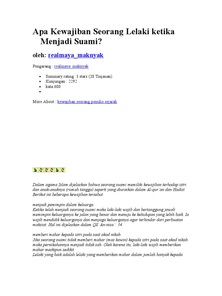 Perkawinan termasuk dalam bidang muamalat, sedang kaidah dasar muamalat adalah ibahah (boleh). Ada hak dan kewajiban bagi mereka termasuk yang berkaitan untuk itu, perlu diketahui dan dipahami dengan baik beberapa kewajiban suami terhadap istri yang telah dijelaskan sesuai. إِنَّ مَا تُوعَدُونَ لَآتٍ ۖ وَمَا أَنْتُمْ بِمُعْجِزِينَ. Kewajiban menuntut ilmu dalam menurut al qur'an dan al hadits ahmad zaid hasanudin insitut agama islam negri juuraisiwo metro jalan ki hajar dewantara no. Tempatkanlah mereka (para istri) di mana kamu (suami) bertempat tinggal menurut kemampuan kamu, (qs.